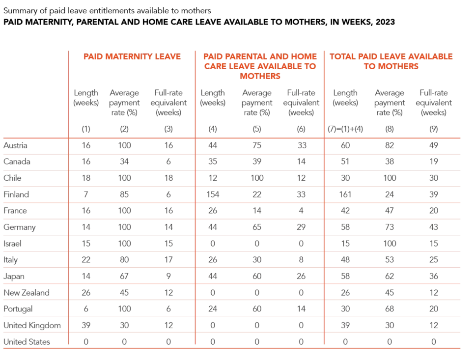 To illustrate how these two ideas play out in practice, consider the following chart of mothers’ paid leave entitlements in select countries as of 2023: